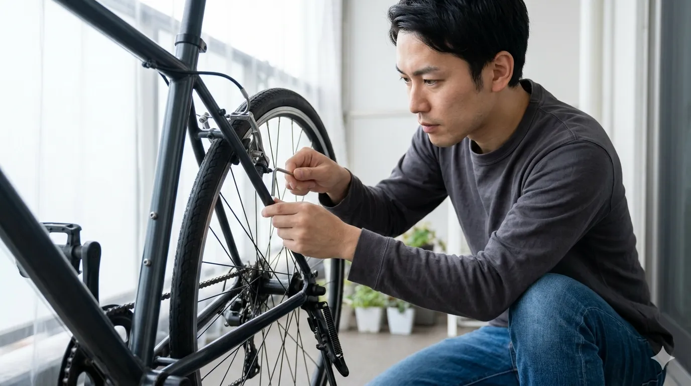自分で対応しやすいのは、ホイールの固定確認、ブレーキの左右の隙間確認、アジャスターによる軽い遊び調整、目に見える汚れの拭き取り、ワイヤーのサビやほつれの確認などです。工具に慣れていない場合は、「部品を外さない」「力任せに曲げない」「元に戻せない作業をしない」を基準にすると失敗を減らせます。