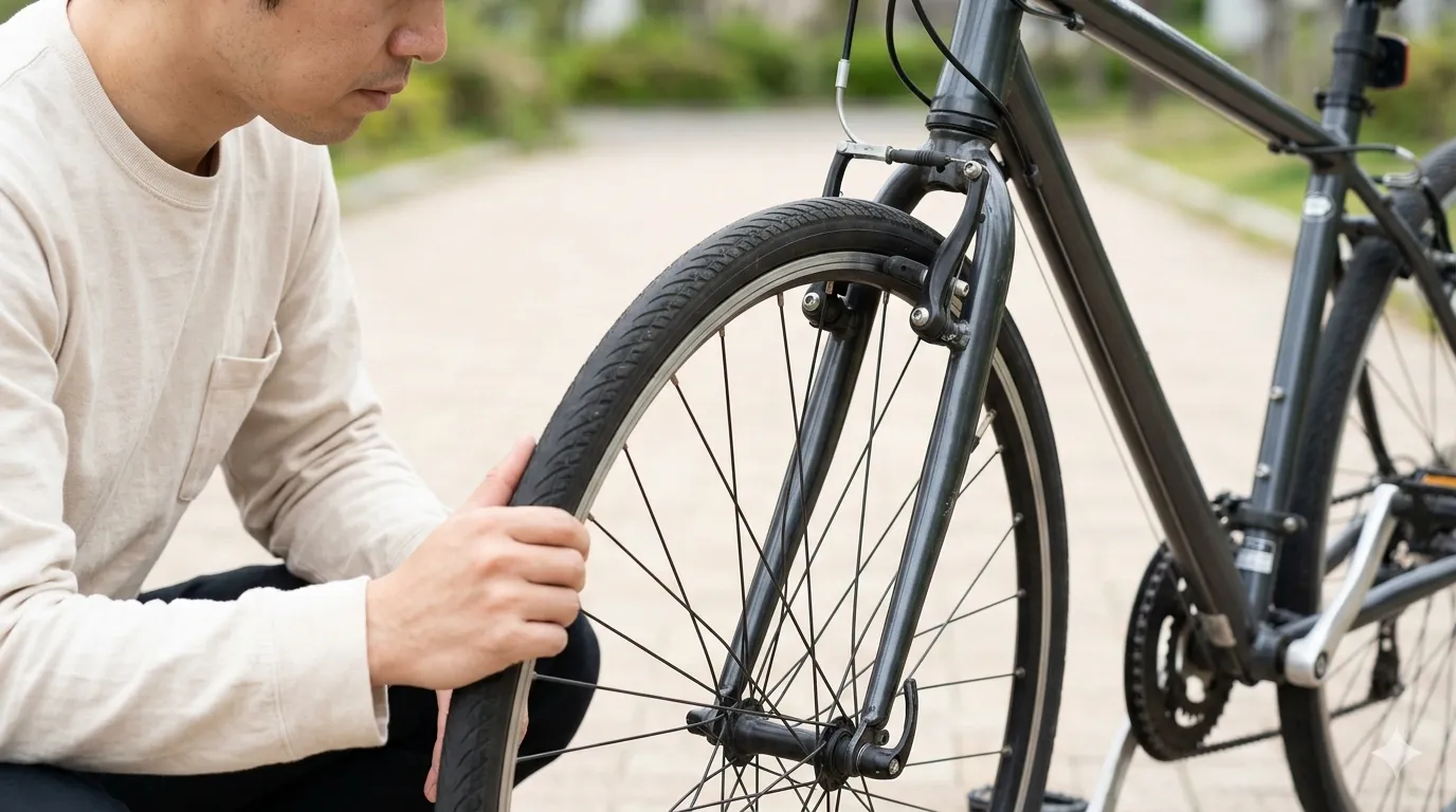 片側だけ擦れる症状は、ホイールが奥まで入っていないだけで起きることがあります。特にクイックレリーズは固定が不十分だと走行中の脱落事故につながるため、走る前に固定確認が強く勧められています(出典:国民生活センター「自転車の前車輪の脱落に注意」)。
