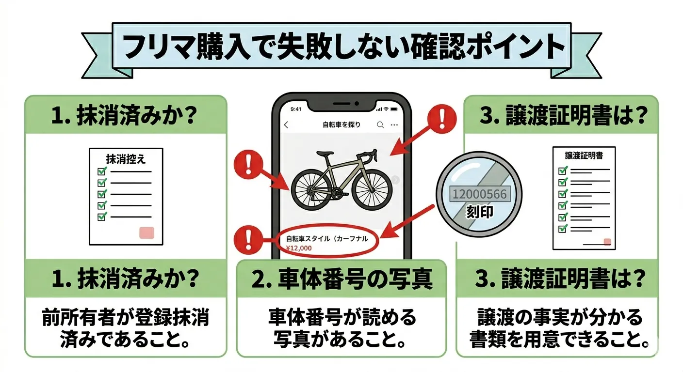 - 例外寄り(フリマ・譲渡で入手):譲渡が分かる書類に加え、前所有者の抹消の有無を確認してから動く。二重登録はトラブルになりやすい。