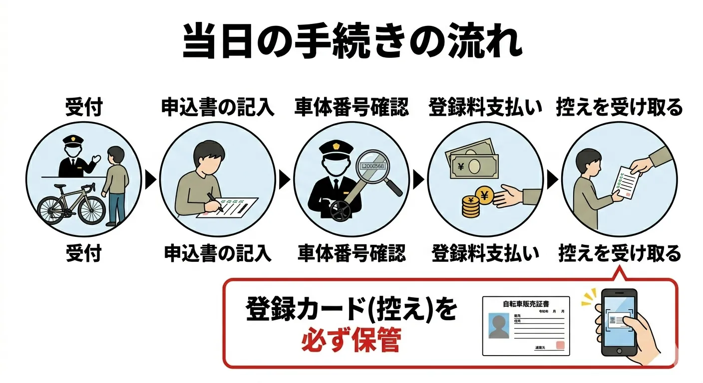 - 受付:自転車本体、身分証、購入証明、登録料を提示する。