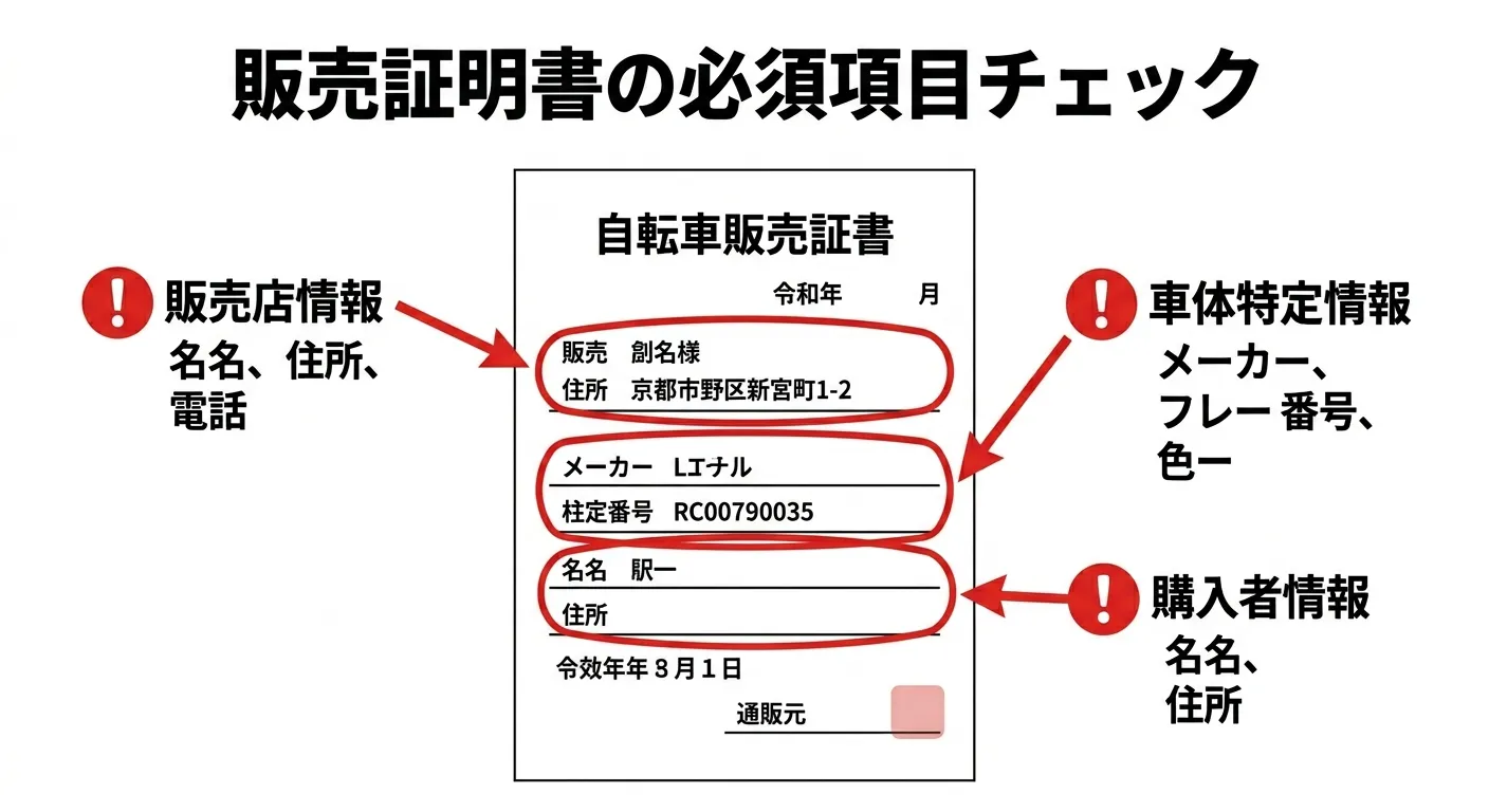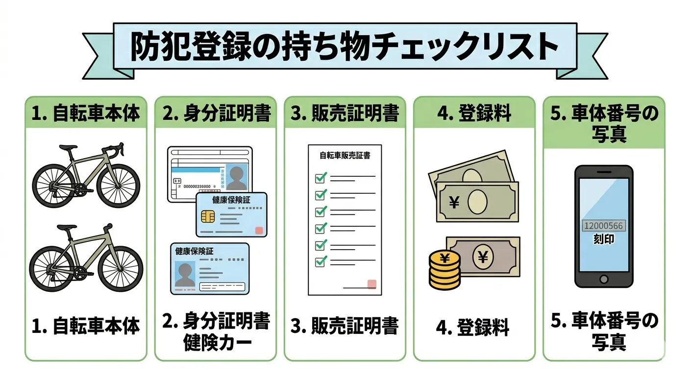 - 典型例(大手通販で新品購入):自転車本体+身分証+保証書または販売証明+登録料。購入履歴の印刷も保険になる。