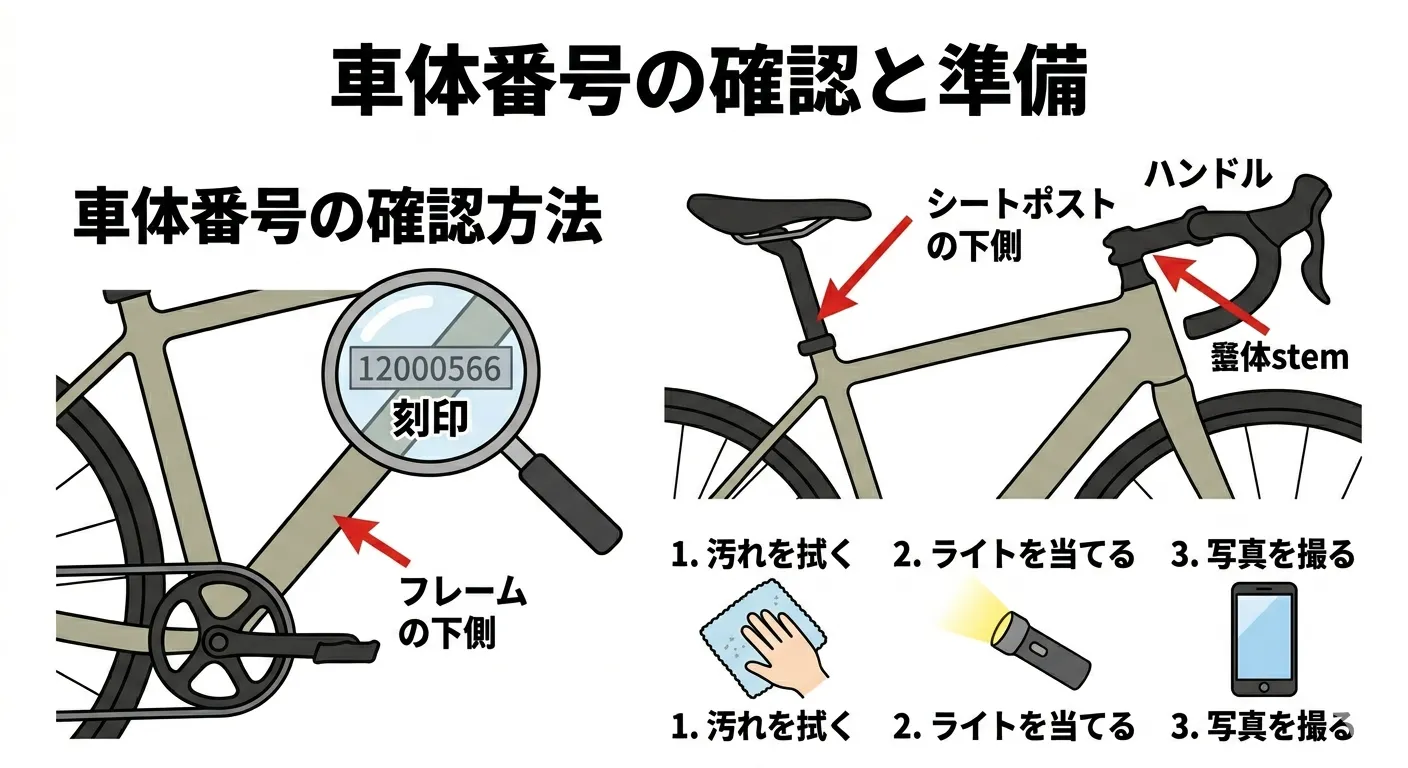 車体番号はフレームの下側などに刻印されていることが多く、汚れ・反射で読めずに手続きが止まることがあります。軽く拭いてライトで照らし、番号が読める写真を撮っておくと当日が早いです。
