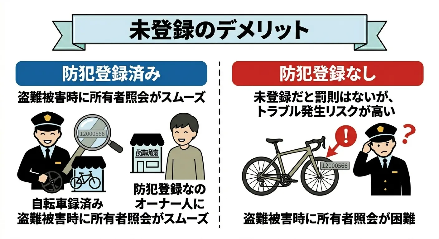 「罰則はない」と案内している例があります(出典:愛知県警)。一方で、防犯登録は法律により義務づけられている旨を県警が説明している例もあります(出典:大阪府警)。未登録だと所有者照会が難しくなる場面があるため、実務的には早めの登録が無難です。